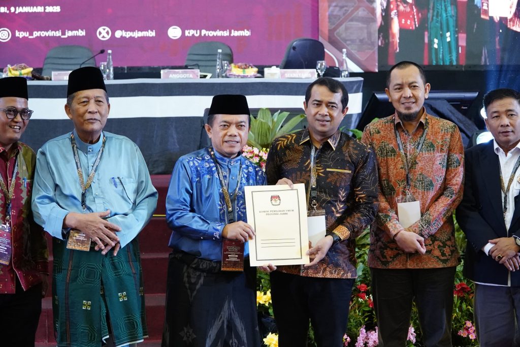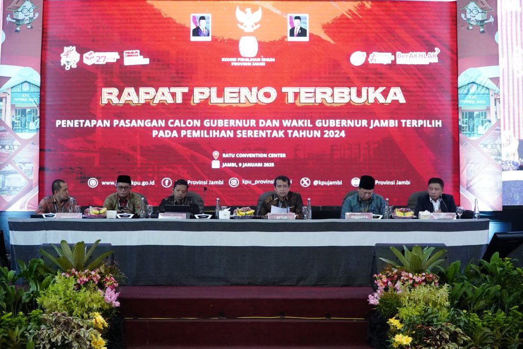 Pada rapat pleno ini KPU menetapkan pasangan Gubernur dan Wakil Gubernur Jambi Terpilih periode 2025-2030 yaitu pasangan H. Al Haris dan H. Abdullah Sani dengan perolehan suara 1.092. 823 suara atau 61, 01 persen.