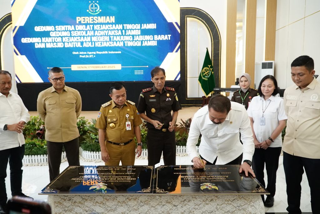 Kabargentala.id, Jambi – Gubernur Jambi Dr. H. Al Haris, S.Sos, MH menghadiri Peresmian Gedung Sentra Diklat Kejaksaan Tinggi Jambi, Gedung Sekolah Adhyaksa I Jambi, Gedung Kantor Kejaksaan Negeri Tanjung Jabung Barat, dan Masjid Baitul Adli Kejaksaan Tinggi Jambi, yang diresmikan langsung oleh Jaksa Agung RI, bertempat di Ballrom Prof. Dr. ST. Burhanuddin Sentra Diklat Kejaksaan Tinggi Jambi, Senin (17/02/2025).